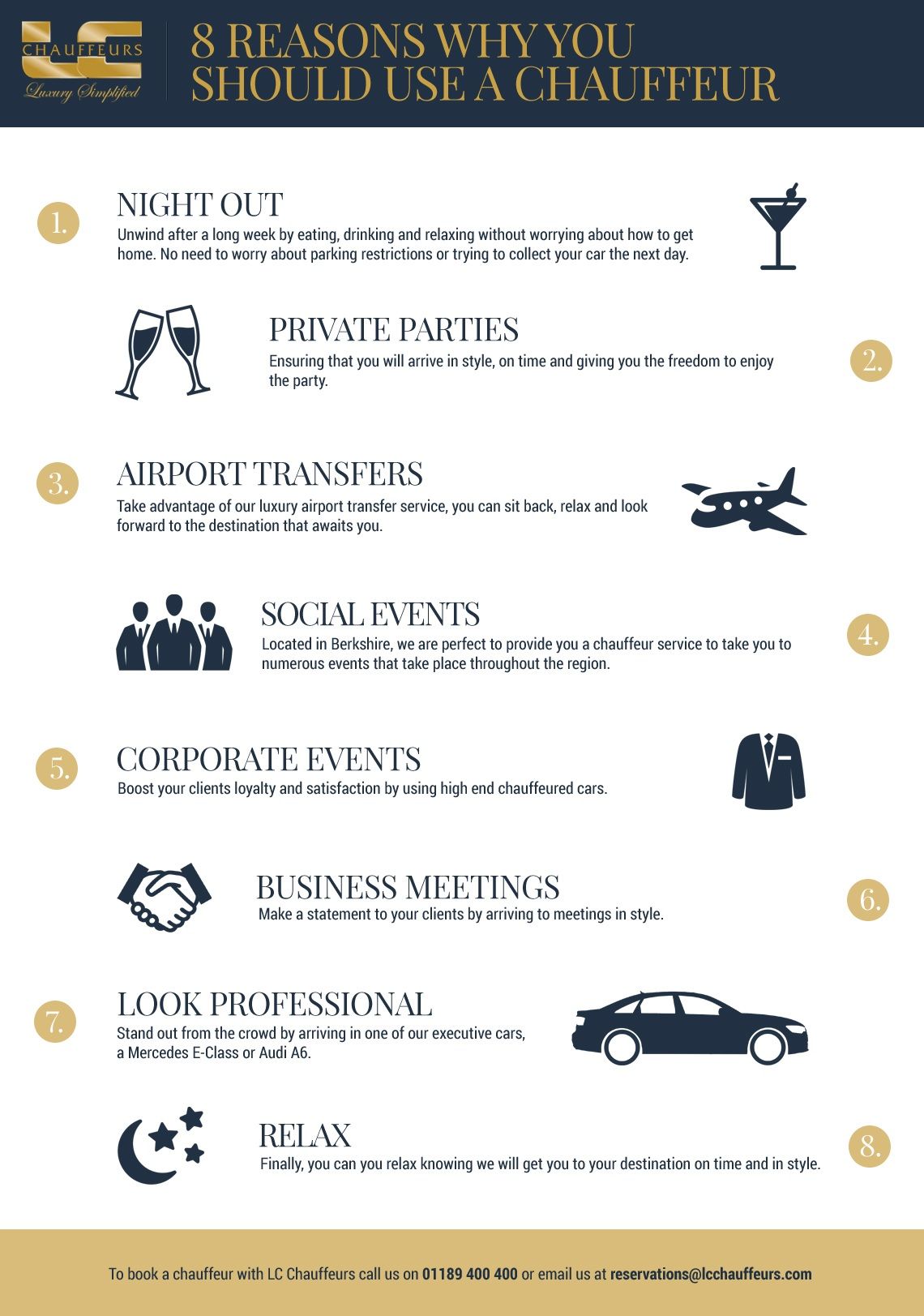If you would like to speak to a member of our team, please call 01189 400 400, however if you would prefer to get in touch with us via email, please send your enquiry to reservations@lcchauffeurs.com.